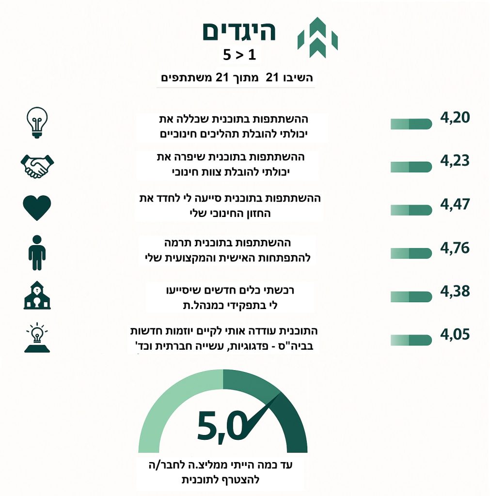 שילוב זה מאפשר לנו לבחון את עצמנו באופן מקיף, להעמיק את ההבנה על תרומתנו בשטח ולהמשיך לפתח ולדייק את העשייה החינוכית שלנו.
