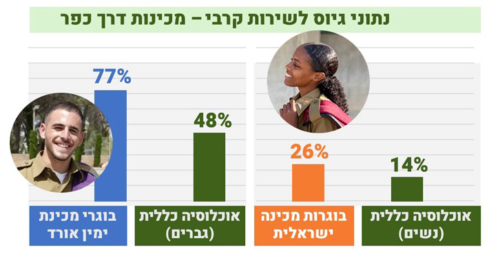 מתוכם, כ-80% מהבנים ו 26% מהבנות שובצו ליחידות קרביות, כולל סיירות ויחידות מובחרות; למעלה מ-20% הגיעו לתפקידי פיקוד וכ-7% לתפקידי קצונה.